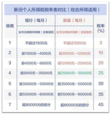 ????????3%、10%、20%三檔低稅率級距擴(kuò)大,25%稅率級距縮小,30%、35%、45%三檔高稅率級距不變。預(yù)測經(jīng)過本次個(gè)稅改革后,中等及以下收入群體稅負(fù)下降明顯。