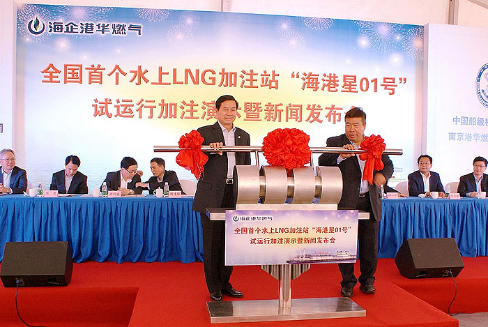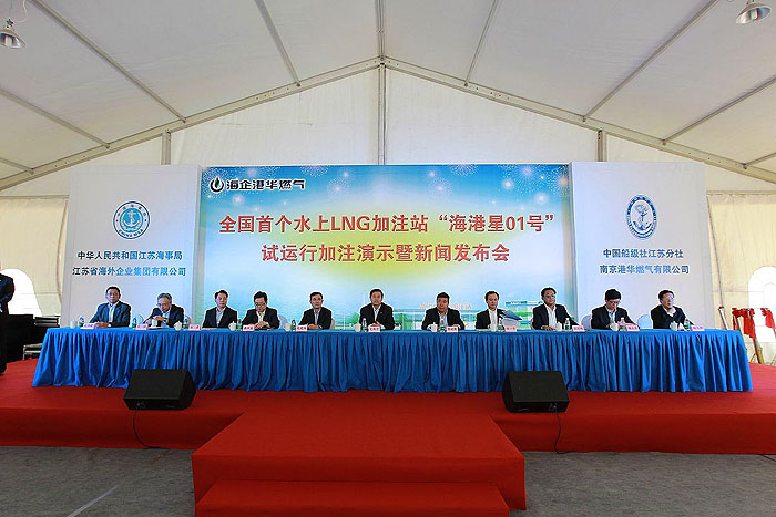 ????????9月26日下午,和風(fēng)旭日、萬里無云。由江蘇海事局、中國船級社江蘇分社、江蘇省海外企業(yè)集團有限公司、南京港華燃?xì)庥邢薰竟餐鬓k,江蘇海企港華燃?xì)獍l(fā)展有限公司承辦的全國首個水上LNG加注站——[海港星01號]試運行加注演示暨新聞發(fā)布會在南京順利舉行。省政府史和平副省長、國家交通部海事局李世新副局長、以及省政府辦公廳、省國資委、省發(fā)改委、省經(jīng)信委、省交通廳、江蘇海事局、省能源局和南京、泰州兩市政府相關(guān)部門的領(lǐng)導(dǎo)出席了本次活動,海企集團和海企技術(shù)公司領(lǐng)導(dǎo)班子全體人員也一同參加了活動。本次活動由江蘇海事局王士明副局長主持。
