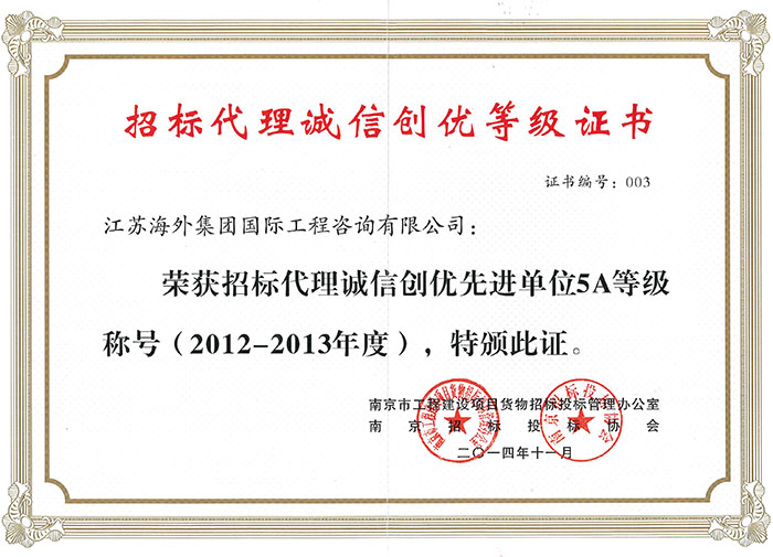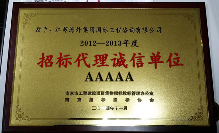 ????????2014年9月,我公司參加了由南京市工程建設(shè)項(xiàng)目貨物招標(biāo)投標(biāo)管理辦公室和南京招標(biāo)投標(biāo)協(xié)會(huì)聯(lián)合舉辦的2012-2013年度“招標(biāo)代理誠(chéng)信創(chuàng)優(yōu)先進(jìn)單位”的評(píng)選活動(dòng)。經(jīng)評(píng)審小組評(píng)定,我司被授予2012-2013年度招標(biāo)代理“誠(chéng)信創(chuàng)優(yōu)”AAAAA級(jí)先進(jìn)單位榮譽(yù)稱(chēng)號(hào),這是公司連續(xù)兩次獲得此項(xiàng)殊榮。