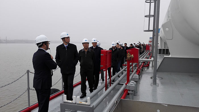 ????????儀式前,與會(huì)嘉賓登上“海港星02”,實(shí)地觀摩了這條長(zhǎng)136米、配有2個(gè)250立方LNG儲(chǔ)罐及可載2000噸柴油的現(xiàn)代化加注躉船,詳細(xì)了解船上的加氣、加油、加水裝置,操作流程,參觀中控室,并就安全措施、消防裝備、LNG的回收利用等問(wèn)題與海企港華工程技術(shù)人員進(jìn)行了互動(dòng)。儀式后,江蘇海事局副局長(zhǎng)王士明還接受了中央電視臺(tái)、江蘇衛(wèi)視等新聞媒體的采訪,就“海港星02”建成的意義、國(guó)家十三五期間對(duì)水污染的治理措施、長(zhǎng)江江蘇段2017-2020年的船舶排放控制區(qū)實(shí)施方案等回答了記者的提問(wèn)。
