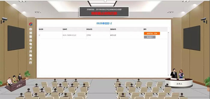 ????? 系統(tǒng)設(shè)置虛擬開標(biāo)大廳,網(wǎng)上實現(xiàn)開標(biāo)、投標(biāo)文件解密、開標(biāo)一覽表網(wǎng)上簽字,同時提供視頻直播、屏幕直播,項目委托人、項目監(jiān)管人員、投標(biāo)單位等遠(yuǎn)程參與和監(jiān)督。