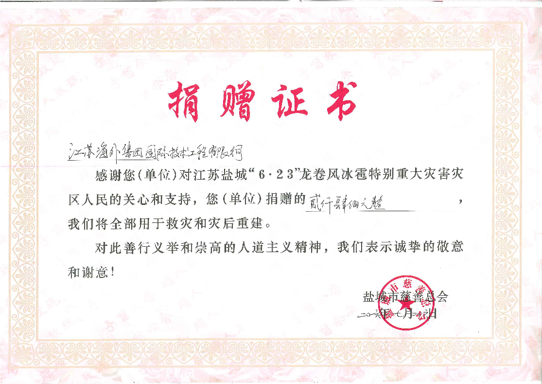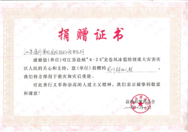 鹽城龍卷風災害捐贈證書