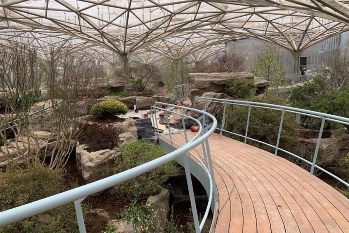 ????????另一個(gè)重點(diǎn)項(xiàng)目——植物園,以亞克力材質(zhì)的傘形建筑而聞名,總共有42把巨大傘狀建筑,占地約1000平方米。事實(shí)上,亞克力材質(zhì)是一種極脆而致密的材料,因此現(xiàn)場(chǎng)施工和維護(hù)非常困難,但更可貴的是,通過(guò)科學(xué)的設(shè)計(jì),在雨傘上方設(shè)計(jì)了一條水流,利用水對(duì)于光的吸收和反射特性,以及亞克力材料的隔熱特性,保證了園內(nèi)綠色植物的采光需求的同時(shí),隔絕多余熱量,形成自然空調(diào)。